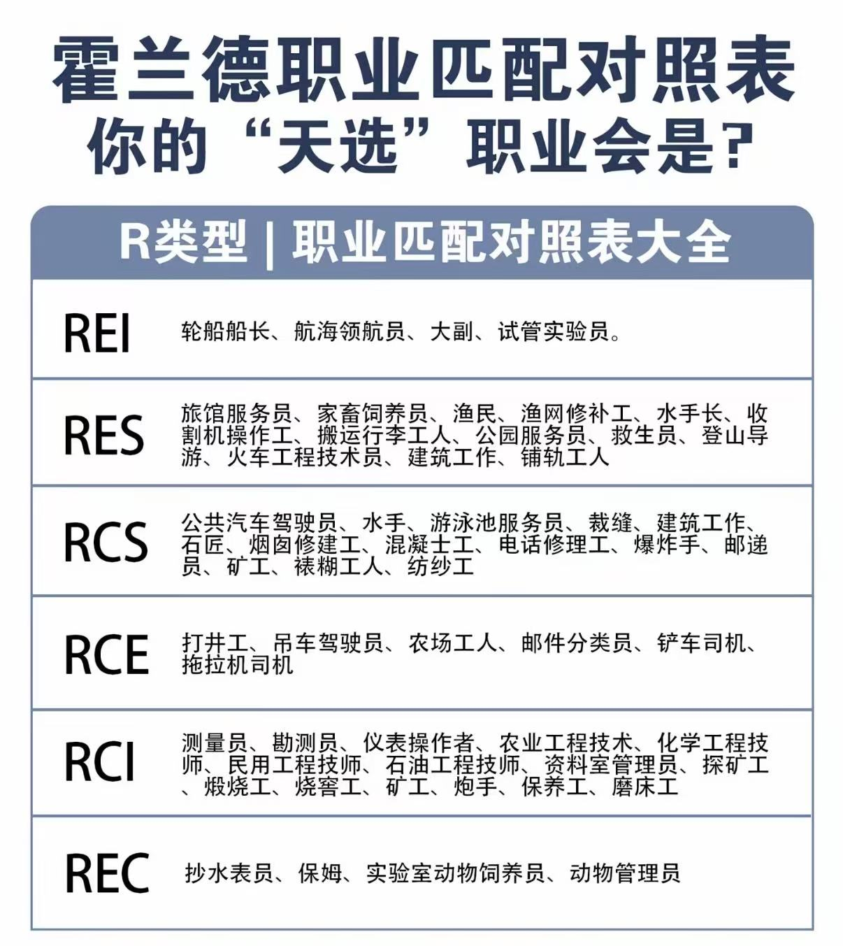 • 常规型(C):注重条理与细节,喜欢结构化工作,如会计、行政人员、图书管理员。