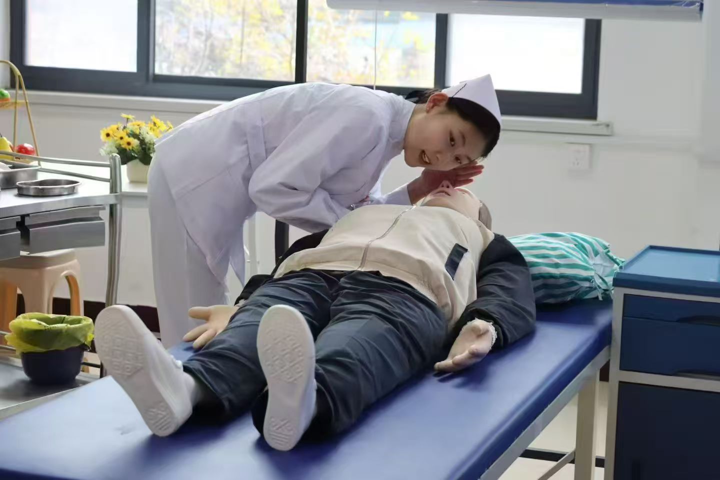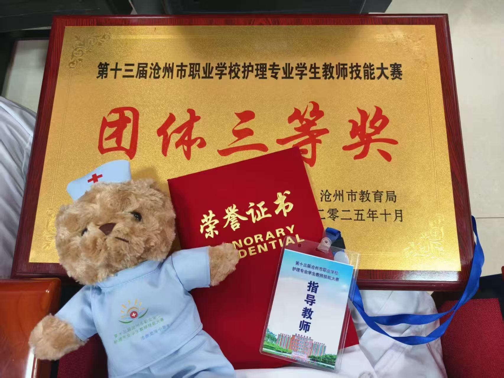 赛场上,她是“指导教师”,也是学生们的“战友”。备赛时,她和学生们一起泡在实训室,纠正动作、梳理流程;赛场外,她为学生们整理服装、加油打气,白色护士服的身影,成了团队最安心的依靠。
