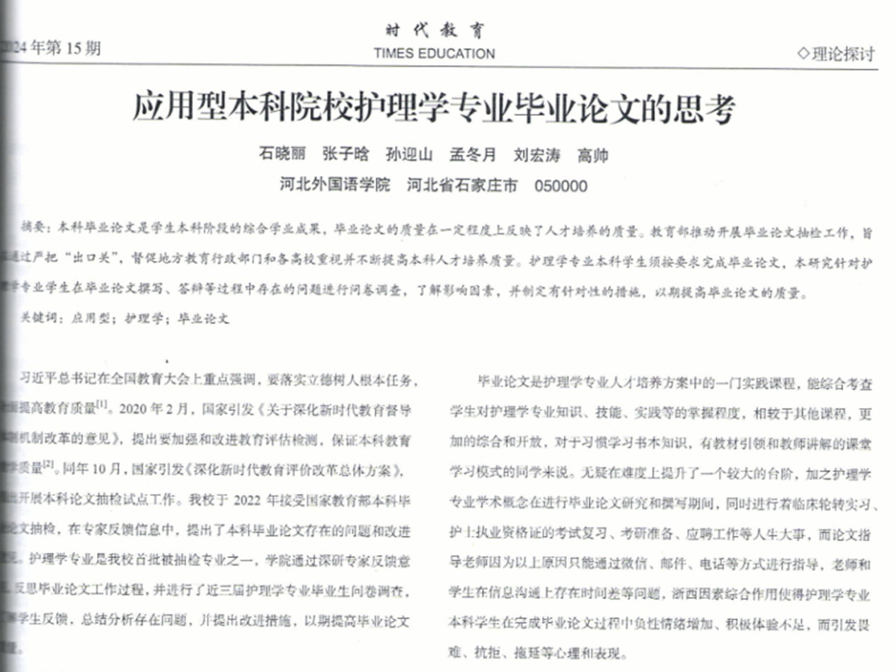 1)《应用型本科院校护理学专业毕业论文的思考》已被万方收入。本研究针对护专业学生在毕业论文撰写、答辩等过程中存在的问题进行问卷调查,了解影响因素,并制定有针对性的措施,以期提高毕业论文的质量。