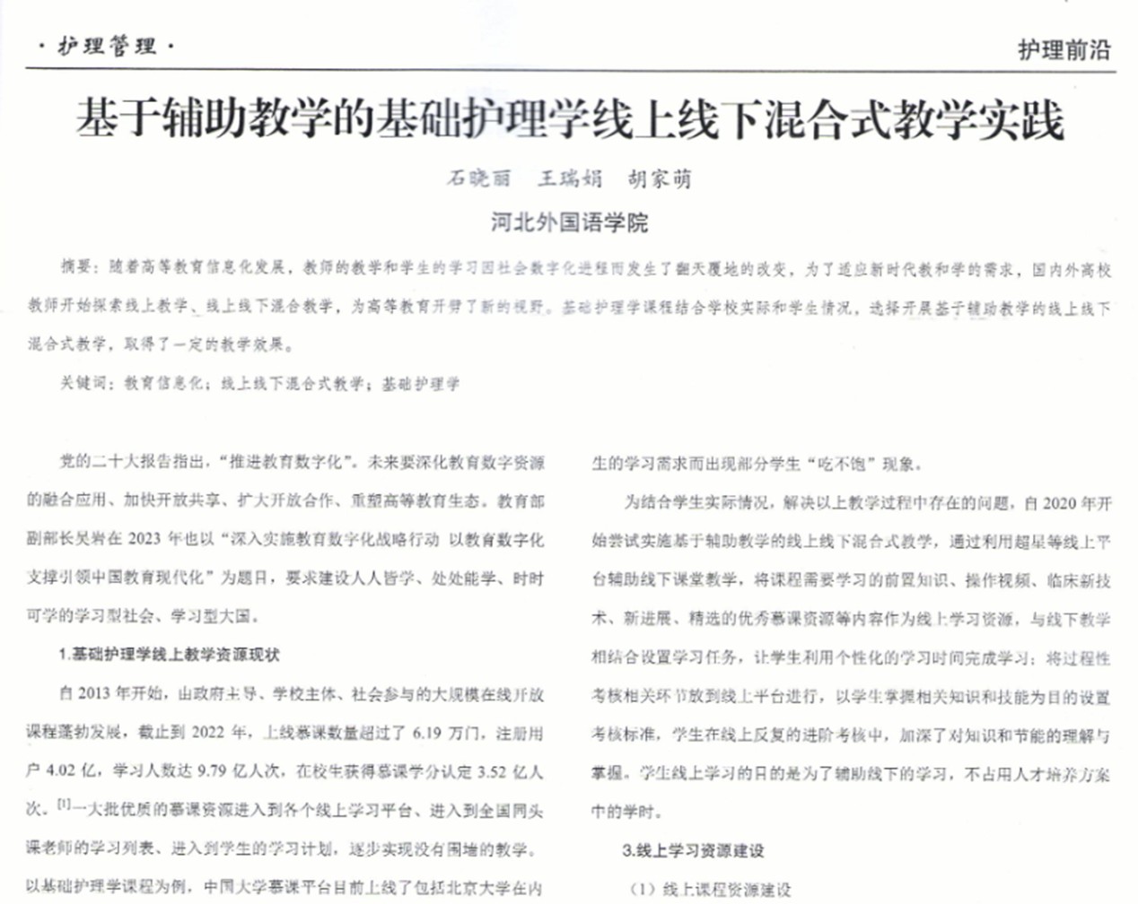 2)《基于辅助教学的基础护理学线上线下混合式教学实践》本研究适应新时代教和学的需求,国内外高校教师开始探索线上教学、线上线下混合教学,为高教育开劈了新的视野。基础护理学课程结合学校实际和学生情况,选择开展基于辅助教学的线上线下混合式教学,取得了一定的教学效果。