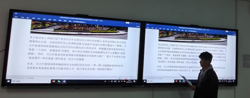 2025年9月22日,为深入实施国际化人才培养战略,助力学子走向世界舞台,河北外国语学院与印度尼西亚布拉维加亚大学推出奖学金项目。本次宣讲项目由河北外国语学院国际医学院外事部组织宣传。