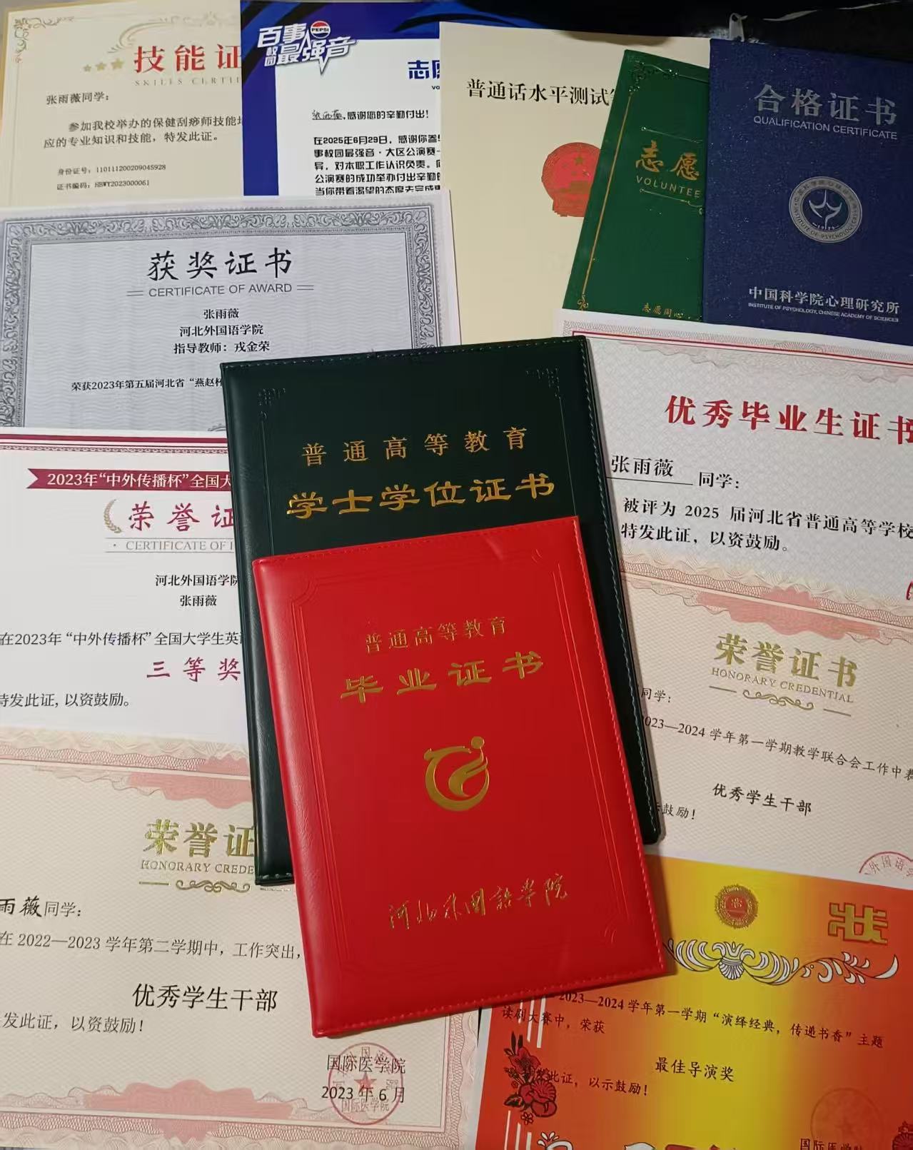 专业领域,张雨薇同样出类拔萃。她考取保健刮痧师技能证书,在"中外传播杯"全国大学生英语竞赛中斩获三等奖,更以优异成绩通过普通话水平测试,为跨文化护理奠定坚实基础。这些证书与荣誉,是她不懈努力的最好见证。